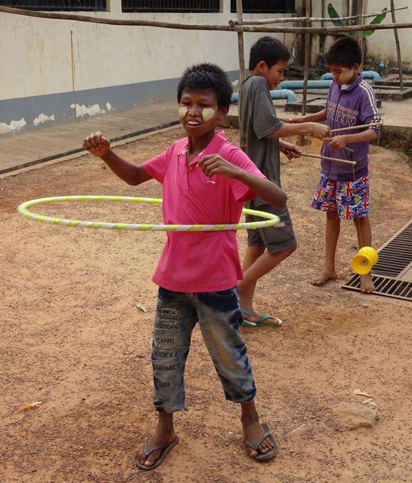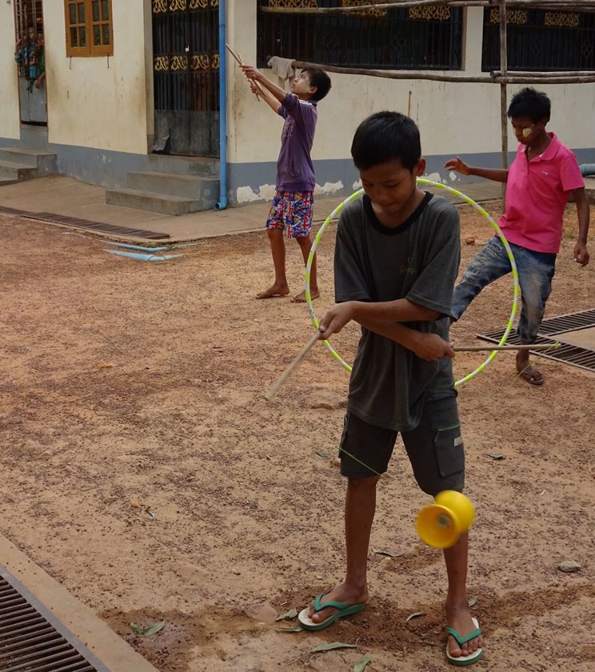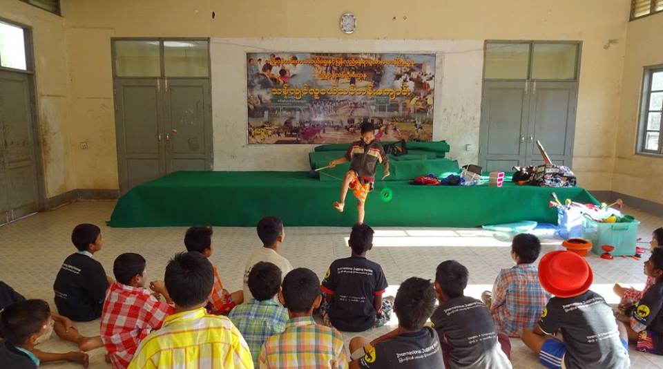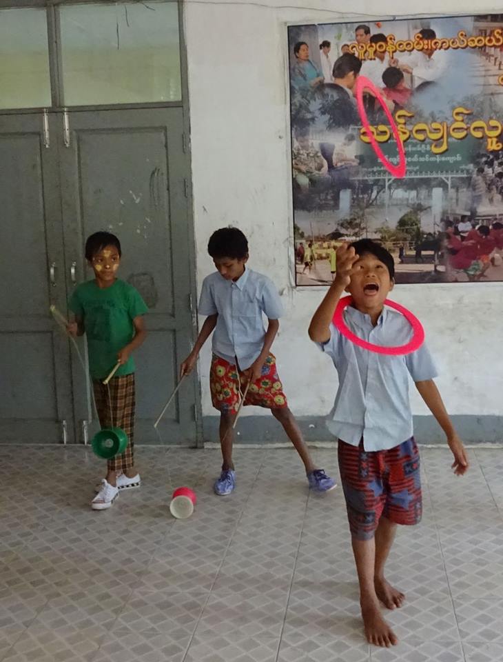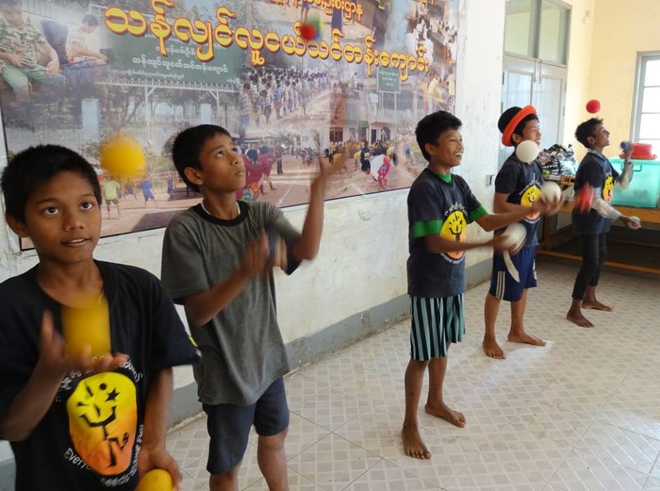 The Civil Society Initiative, a volunteer effort of the British Council Library, visits the centre regularly with a mobile library, reading stories and loaning books to the boys. CSI introduced us to the boys and U Kyaw Oo in 2014 and CSI volunteer Zin Zin is providing fine assistance to Jules as the translator for the Thanlyin workshops this season. CSI and the British Council are supporting the Day of Fun on February 13 when we’ll bring all the circus teams in Yangon together for workshops, rehearsals and presentations. We are very grateful for their support and encouragement for the social circus project. We’re really looking forward to seeing what the boys and other circus teams will get up to when they all get together.