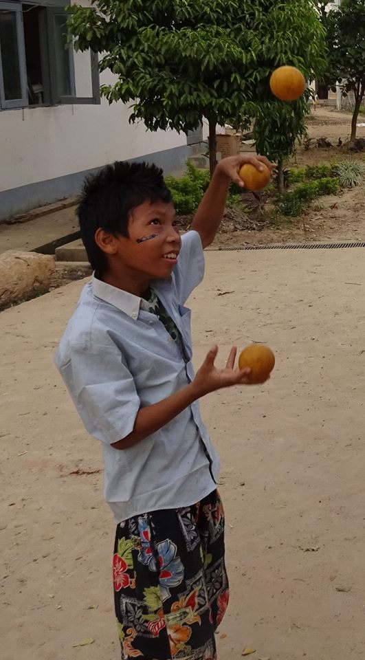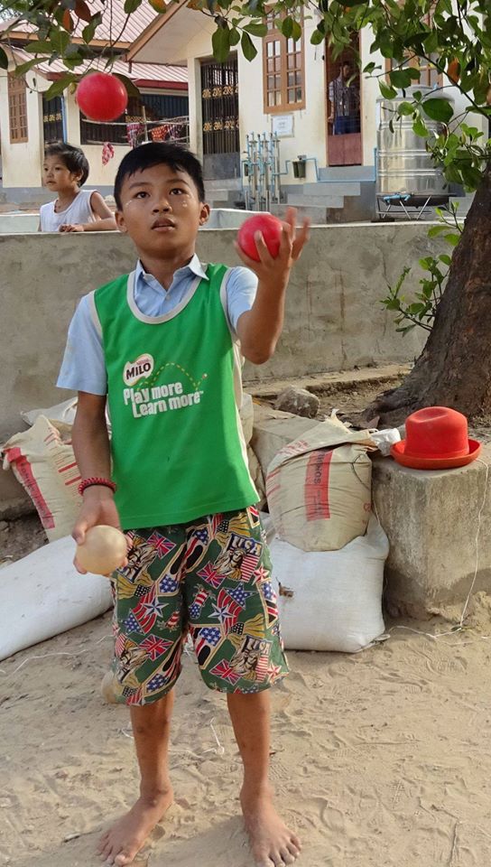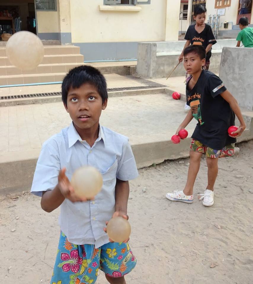 Serious Fun trainer Jules Howarth is teaching 25 boys in the circus team at Thanlyin Boys’ Training Centre, who he describes as the best young jugglers in Burma currently, full of humour and madcap energy. Many are in their second season with Jules and they’ve been working hard on their circus skills. When Jules returned in December, they turned out for the first workshop wearing their T-shirts from last year’s International Juggling Festival, proudly showing off the “everyone needs to have fun” logo and eager to show Jules what they’d been practising.
